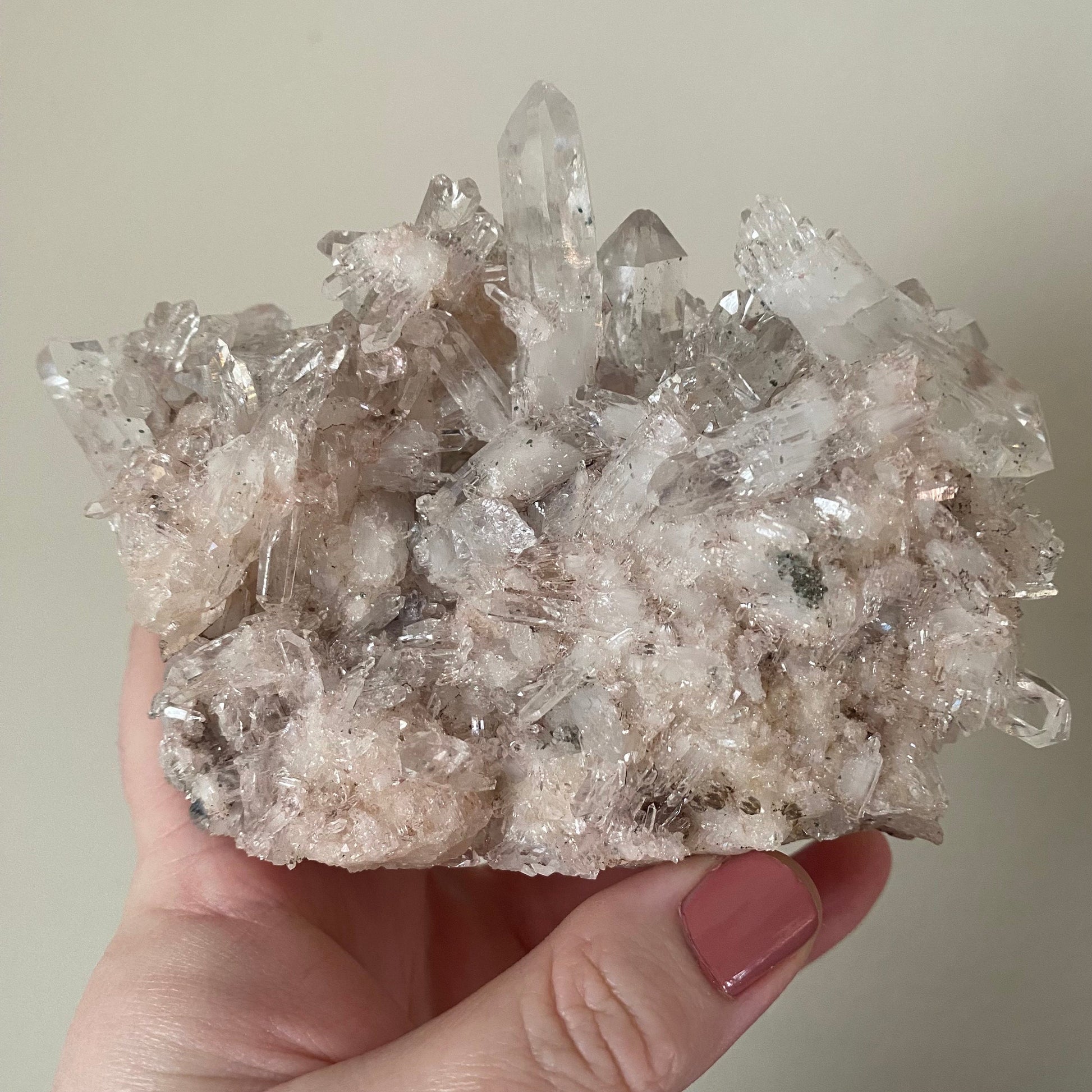 These sacred Pink Lemurians are a rare find from Santander, Colombia. They are even prettier in person and slightly pinker than the camera will capture in natural light. AAA grade
